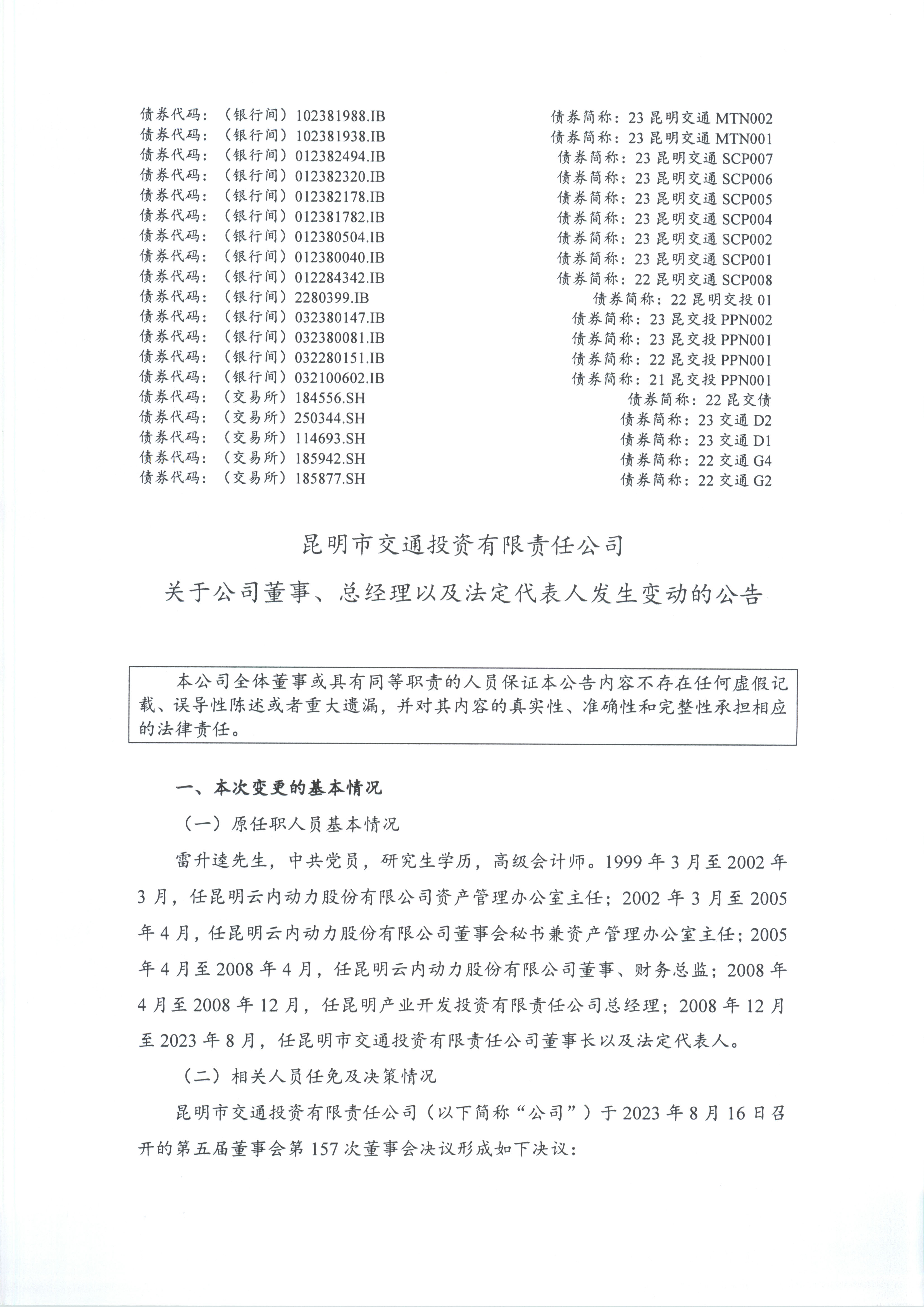 昆明交投公司董事、总经理以及法定代表人发生变动的公...